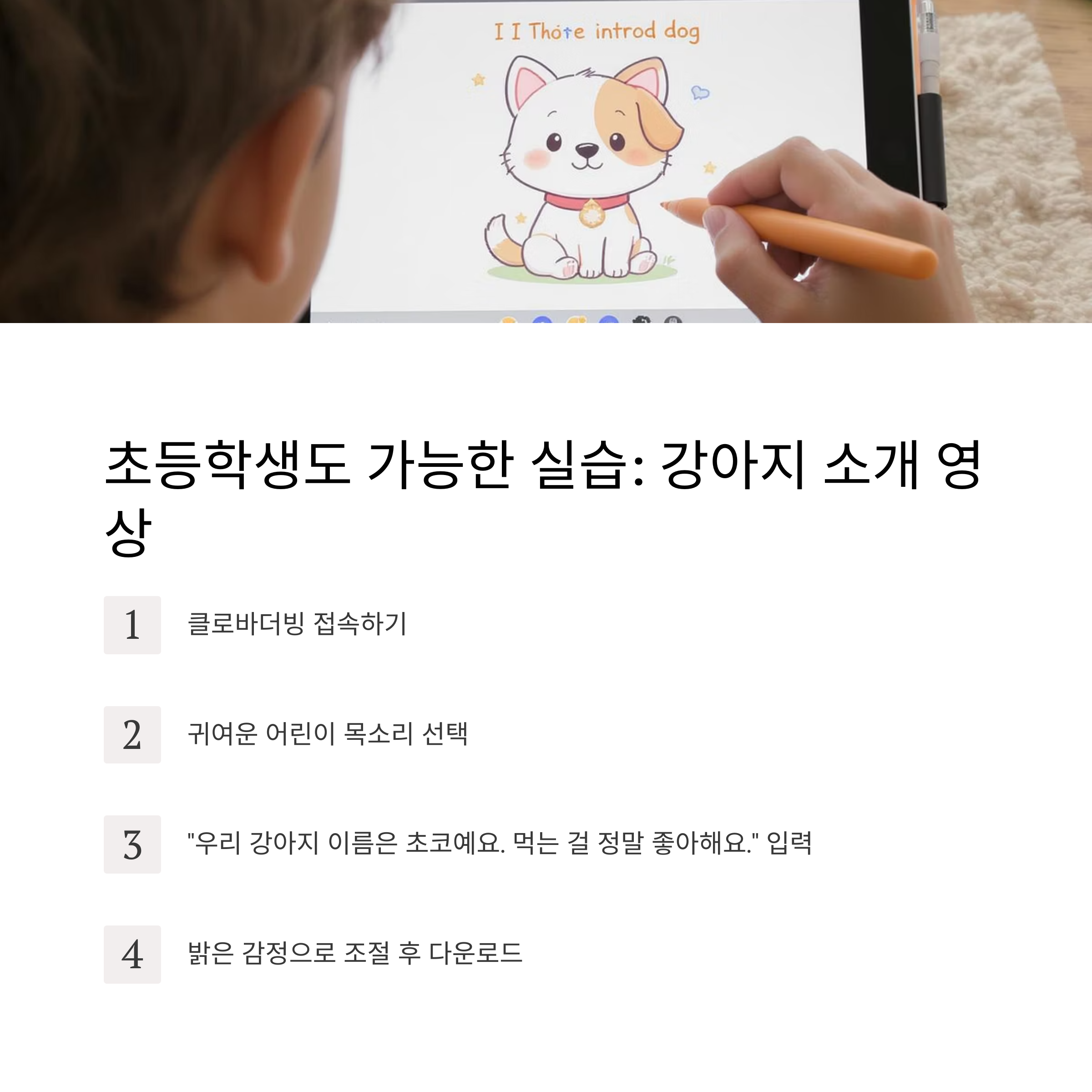 - 대본 입력: "우리 강아지 이름은 초코예요. 먹는 걸 정말 좋아해요."